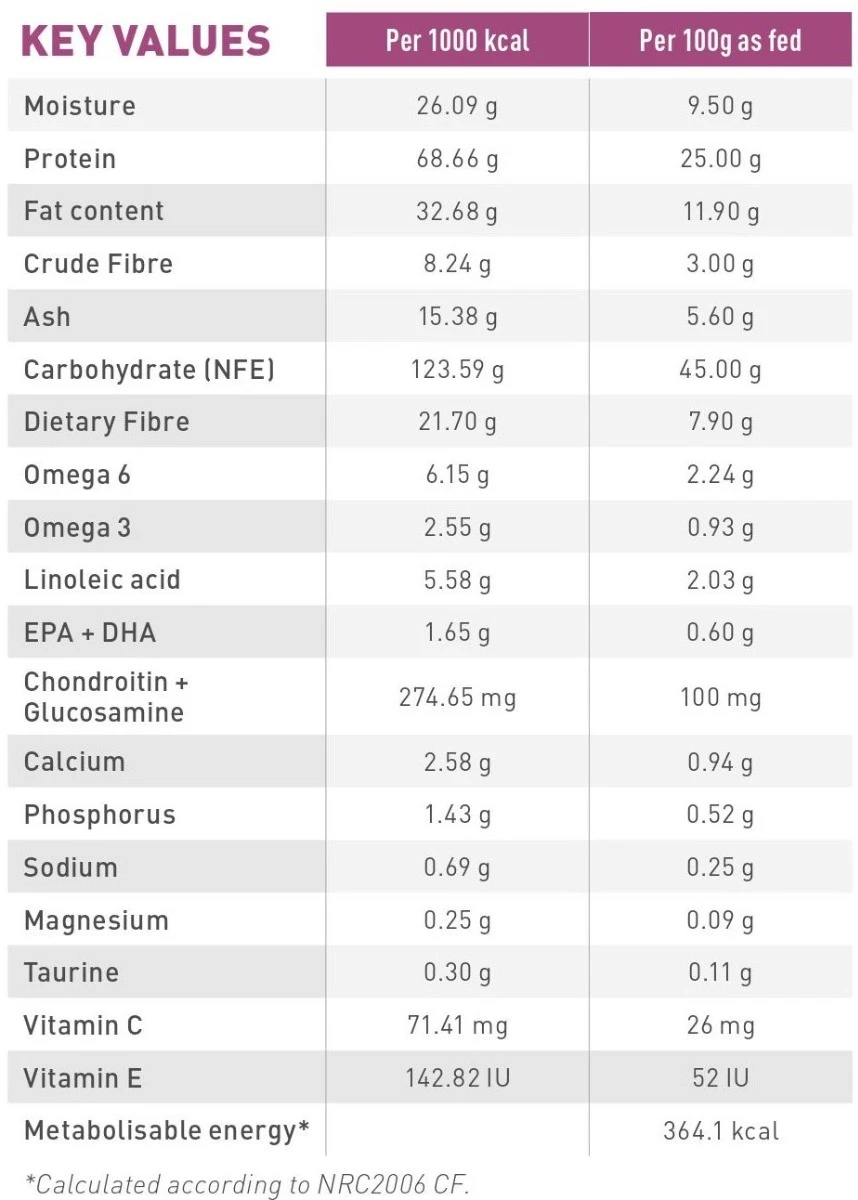 Het verlaagde energiegehalte helpt het ideale gewicht van je hond te behouden waardoor zijn gewrichten minder worden belast.